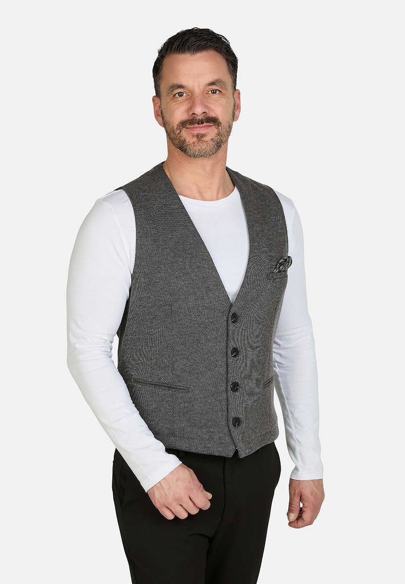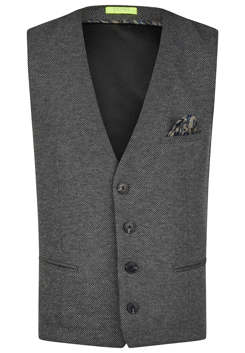 Mit der 2-Tone Sakko Weste aus der Winter-Kollektion von CALAMAR bist Du bei besonderen Anlässen auch in den Wintermonaten modern und stylisch gekleidet. Die Herrenweste im Regular Fit kombiniert ein Innenfutter aus Polyester mit einem Außenmaterial aus einer elastischen Polyester-Mischung. Das Obermaterial weist eine schöne Strickoptik auf, mit dem Du sogar bei Hochzeiten glänzen kannst. Den stilvollen klassischen Look kombiniert die CALAMAR Weste mit einem modernen, körpernahen Schnitt. Seitliche Doppelpaspeltaschen und eine Leistentasche auf Brusthöhe mit Einstecktuch perfektionieren das elegante Design der Herrenweste. Ob solo zum Hemd oder in Kombination mit dem passenden Sakko, mit dieser CALAMAR Weste bist Du immer gut angezogen.