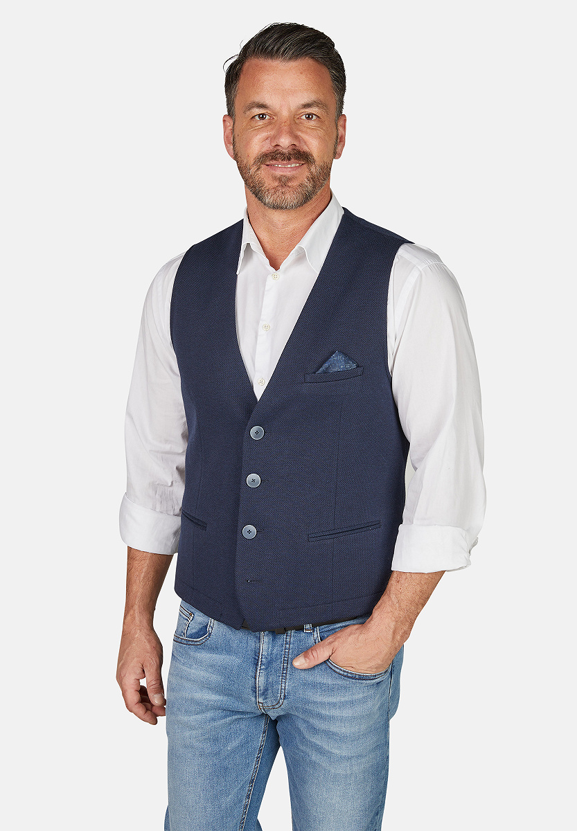 Die CALAMAR Weste aus Baumwollmix ist ein smarter Begleiter für Deine Outfits. Seitliche Doppelpaspeltaschen und eine Brusttasche sorgen für Funktionalität, der körpernahe Schnitt bringt moderne Eleganz. Innen gefütterte Seitenteile und weichstrukturierte Baumwollware runden die hochwertige Verarbeitung ab. Eine Herrenweste, die Business und Casual gleichermaßen ergänzt.